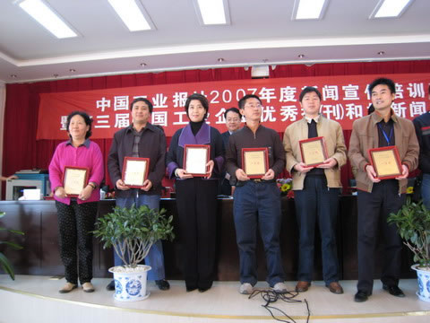 本报讯 日前,在云南省大理市召开的中国工业报社2007年度新闻宣传培训班暨第三届中国工业企业优秀报刊和好新闻领奖大会上,我《永信贵宾会集团报》被评为中国工业企业2007年度优秀报刊一等奖,其获奖语是:栏目丰富、形式活泼、文章短小精悍,并出版中德双语报,便于外籍专家了解企业动态。本报记者陈烈新采写的《首席工程师加冕仪式在中科院杭州科技园举行》报道,荣获好新闻(消息)评选二等奖,这反映了我集团重视人才队伍建设引起了媒体的关注和肯定。集团公司党委书记董事长朱金根获悉,当即给出席颁奖会的主编王忠民发贺讯:“祝贺你,并与你们共享荣誉和喜悦!”