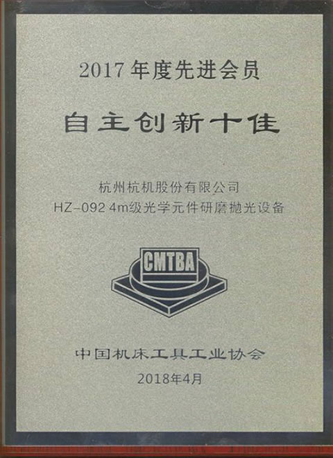 2018年4月,中国机床工具工业协会开展了2017年度中国机床工具工业协会先进会员(十佳)表彰活动,我公司凭借“HZ-092 4米级光学元件研磨抛光设备”项目荣获2017年度中国机床工具工业协会“自主创新十佳”称号。