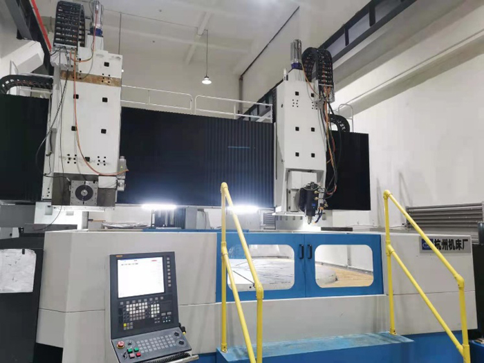 在横梁上有两套横向拖板,横向拖板沿横梁导轨做横向运动,横向拖板的横向运动为X1、X2轴。横向拖板前部有垂直拖板,垂直拖板沿横向拖板上作垂直升降运动,即Z1、Z2轴。