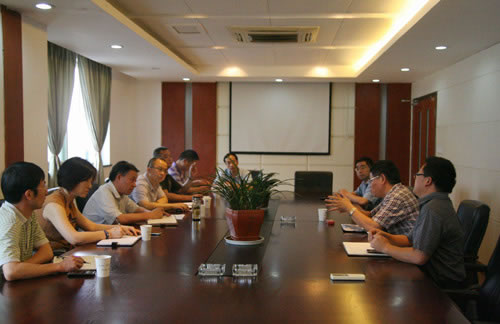 图为临安市吴春法副市长(左三)一行在听取公司领导汇报